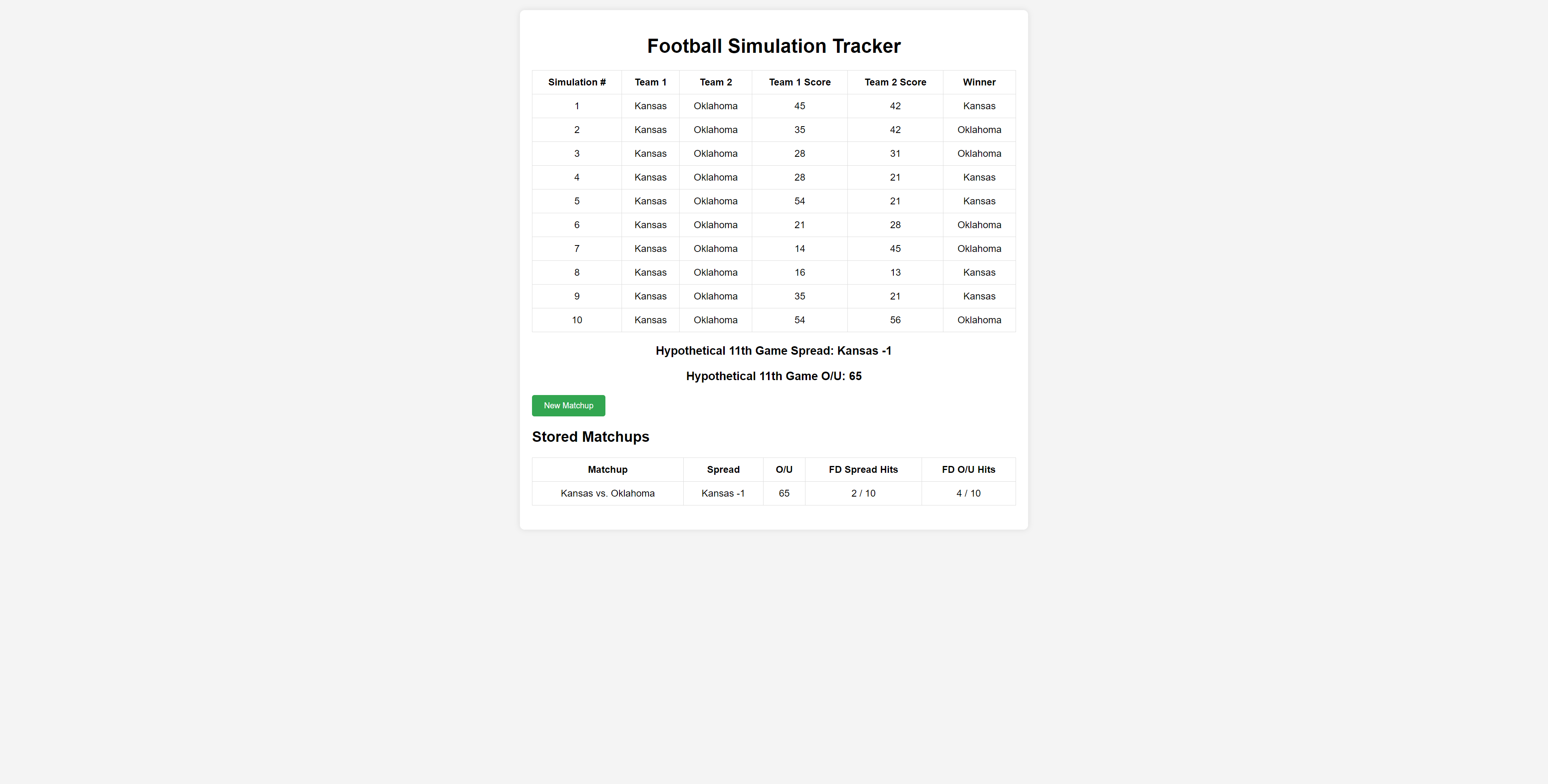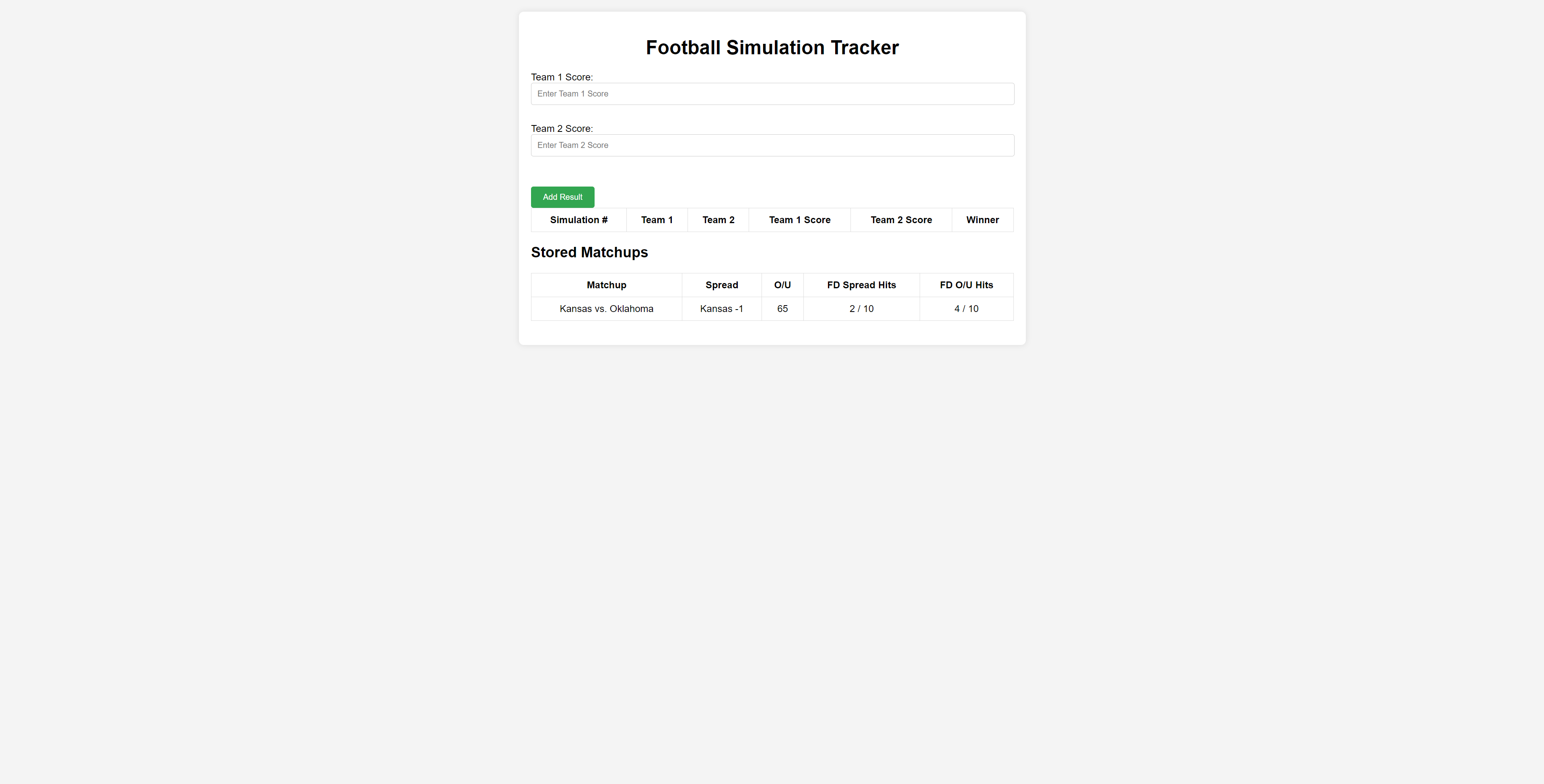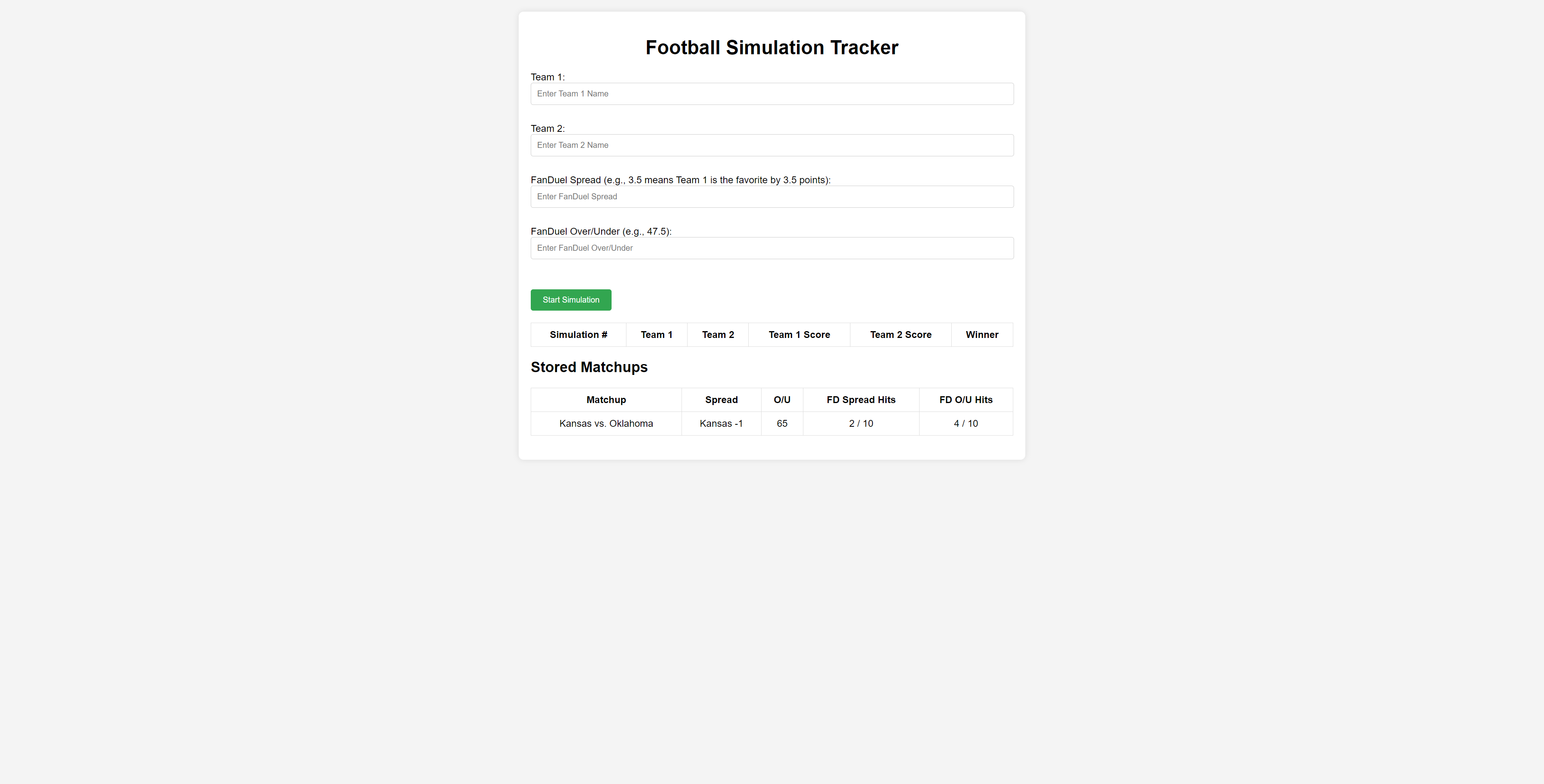 This is a tracker for your own personal football simulations. This does not contain an embedded simulation system (yet). This also does not connect to a server so refreshing the page will delete your stored results! Just used primarily as a easier and more visually pleasing way to track results!